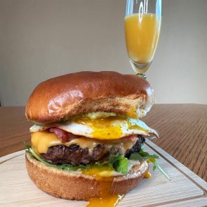 mothers day brunch burger with a mimosa using schweid and sons burgers. topped with a fried egg, avocado spread, american cheese, arugula, and garlic aioli