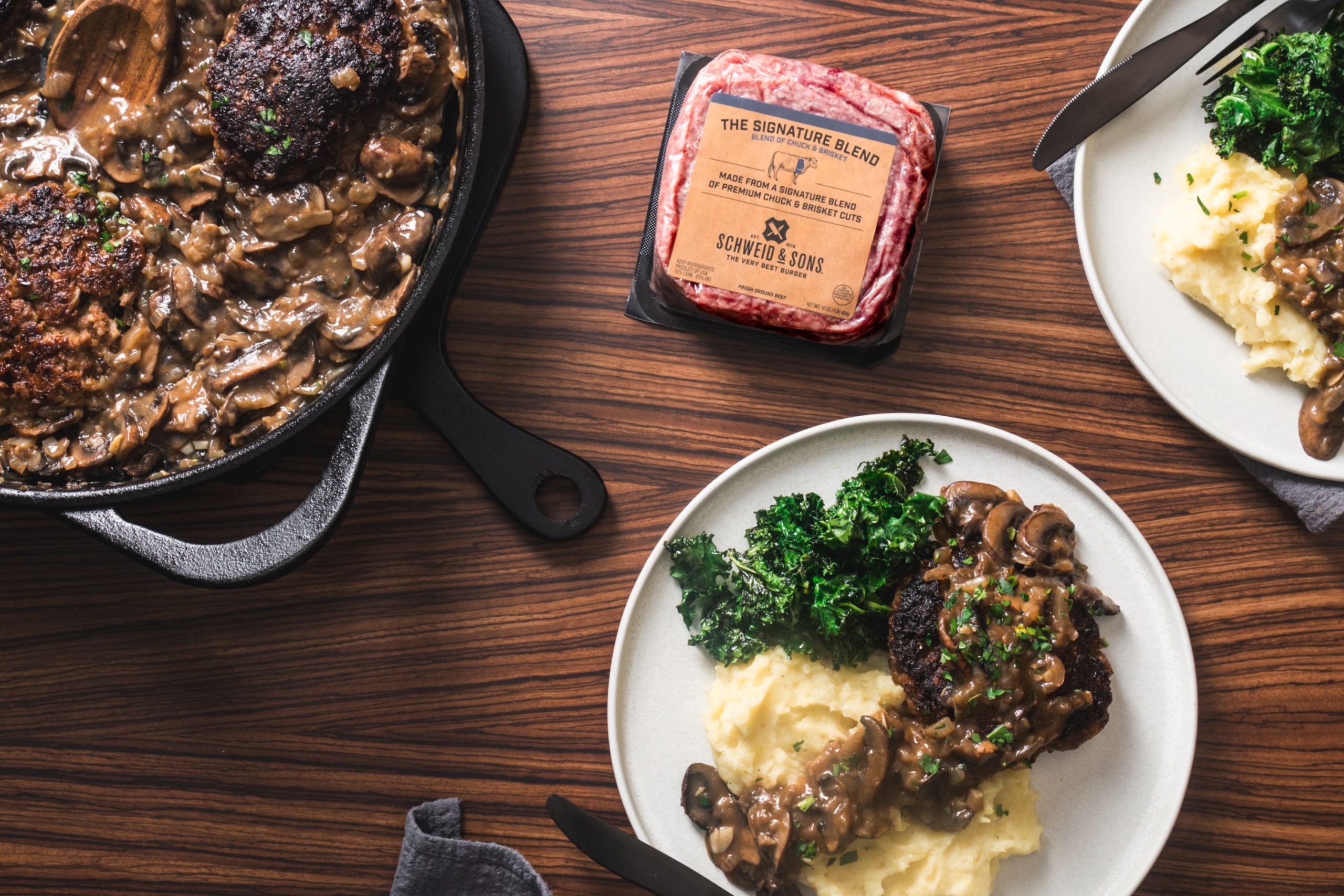 salisbury steak recipe using schweid and sons the signature blend ground beef. With a side of mashed potatoes and sauteed kale